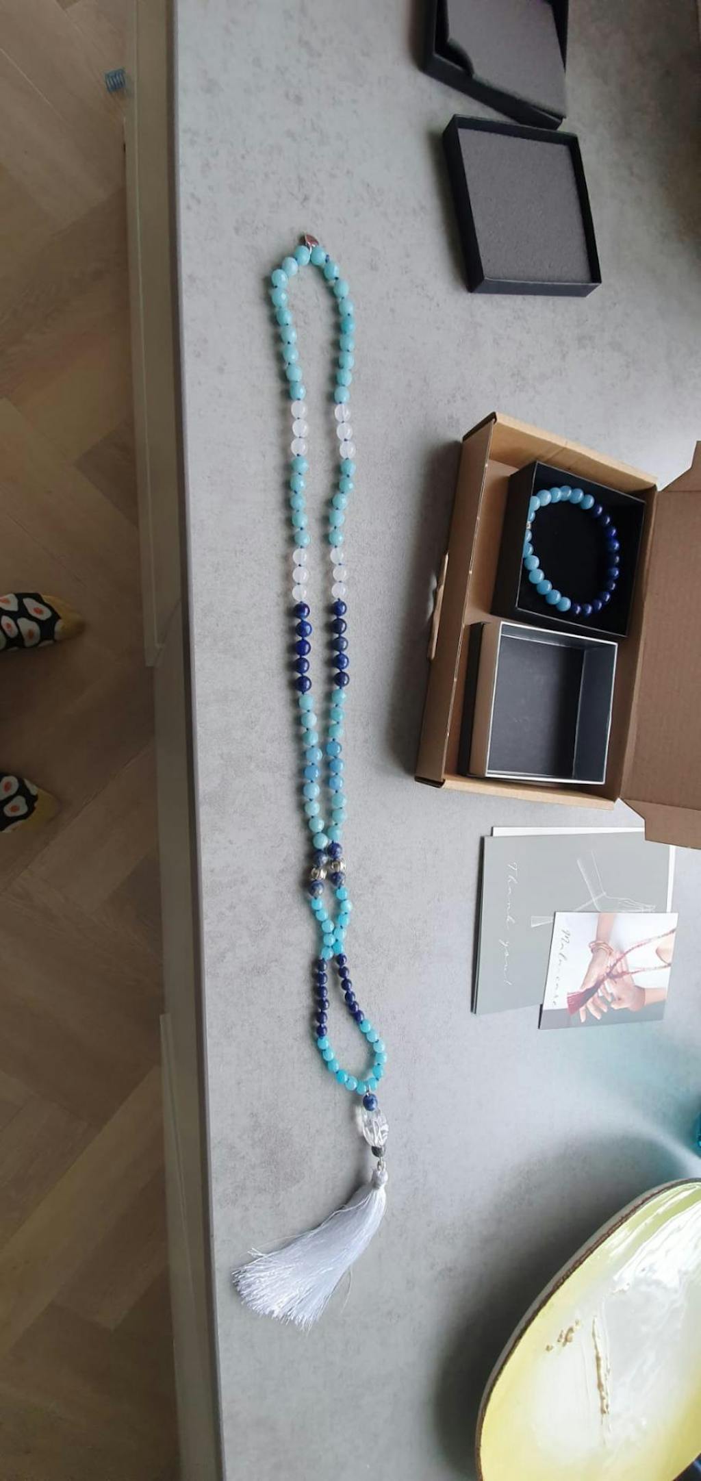 The Mala gracefully drapes approximately 60cm until the edge of the tassel, allowing its rich and powerful energies to envelop you. Trust, let go, and be carried away by the harmonizing forces of the Blue Sea Harmony Mala. Whether in meditation or daily wear, this radiant creation beckons you to embrace the ebb and flow of life with grace and serenity.