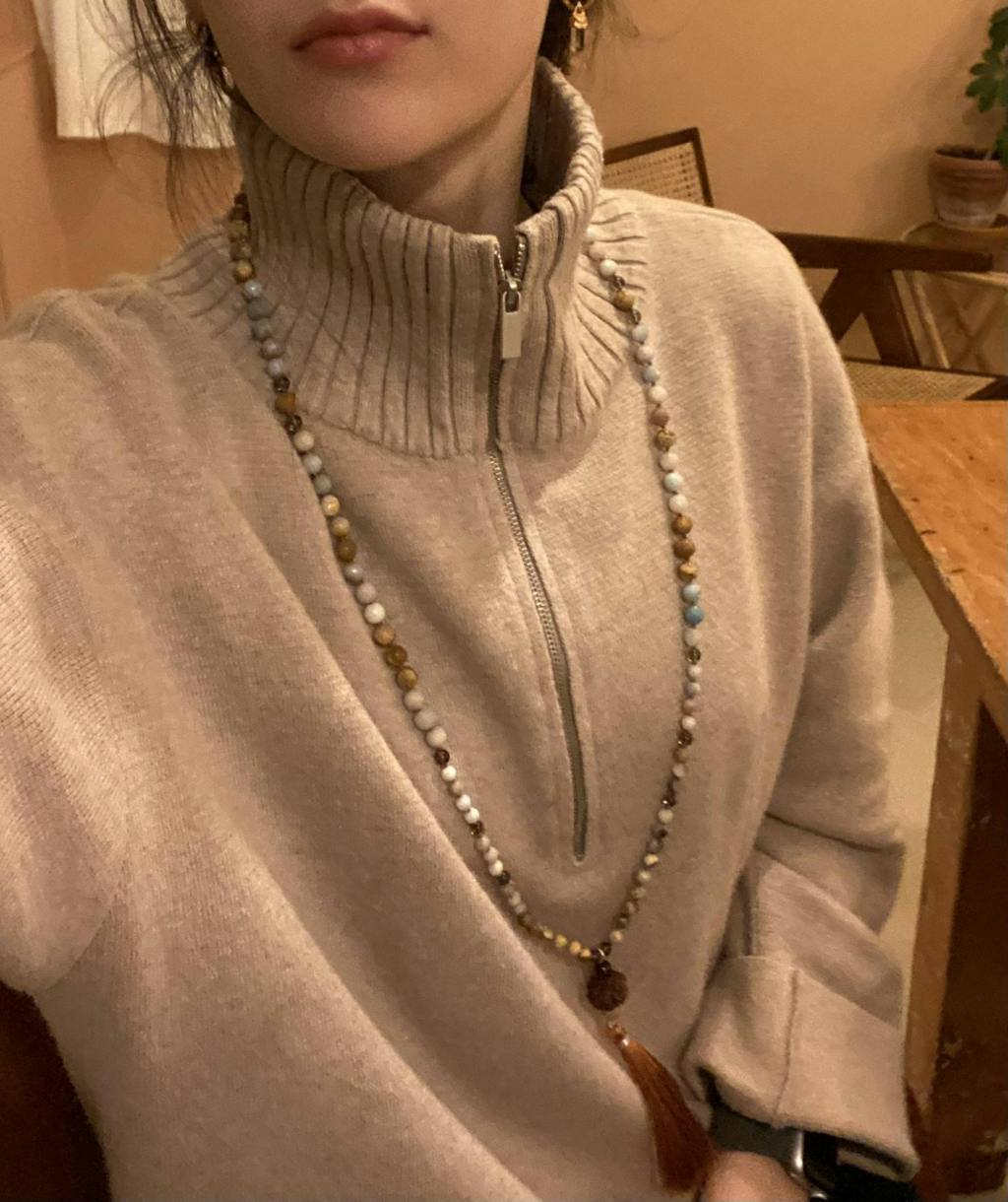 Gemstones we used are Jasper, Amazonite, and Smokey Quartz and a sacred Rudraksha Guru bead.